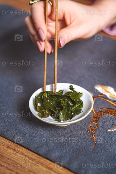 Пара палок, умело держащих свежие зеленые водоросли, красиво представленные на тарелке