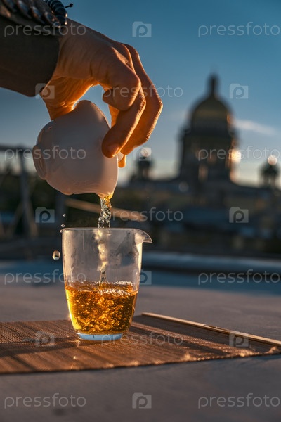 Подготовка коктейля 'Закат' с удивительным фоном городского пейзажа как визуальное удовольствие