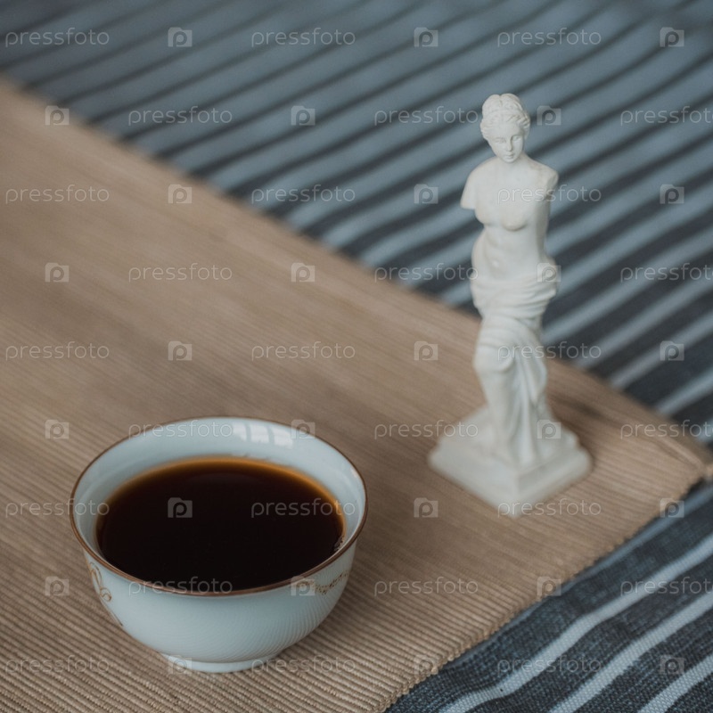 Красиво составленный спокойный натюрморт с чашечкой кофе и классической статуей на полосатой скатерти
