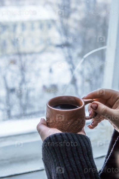 Запекая в руках теплую чашку вкусного кофе, я наслаждаюсь прекрасным снежным видом на улицу зимнего утра
