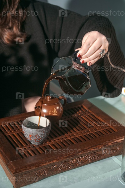 Рука наливает ароматный чай из деликатного чайника в изысканную чашку, демонстрируя спокойную чайную церемонию