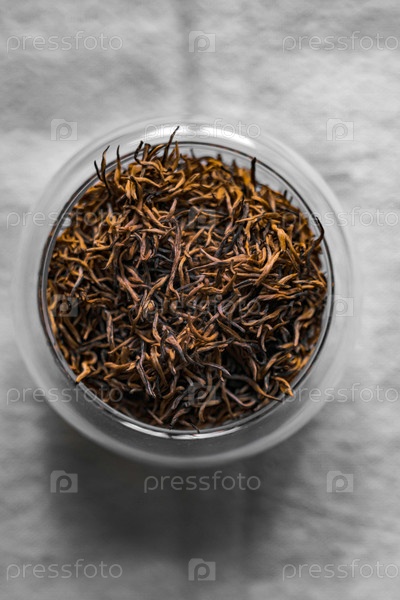 Сушеные чайные листья красиво отображаются в элегантном стеклянном контейнере, готовом к завариванию свежего чая