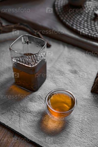 Элегантная и стильная стеклянная посуда с янтарным ликером, умело установленная на поверхности деревни