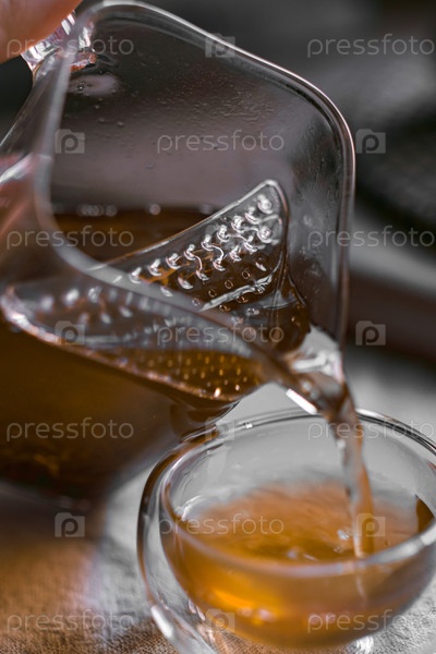 Налейте чай из стеклянной кастрюли в маленькую элегантную чашку для свежего опыта