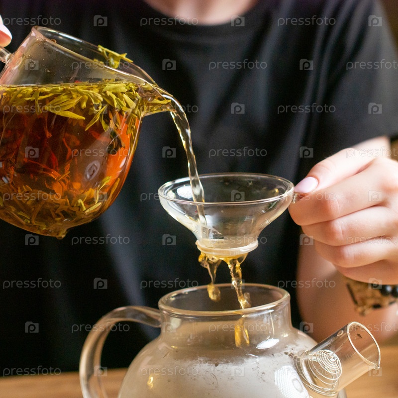 Мужчина аккуратно наливает ароматный парфюмерный чай через тонко тканого детеныша в гладкий стеклянный чайник
