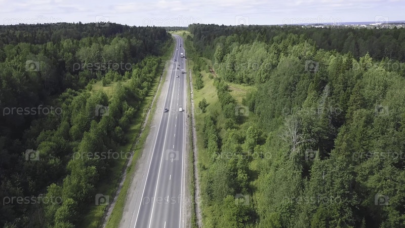 Вид на шоссе в лесу. сельское дорожное движение с городом на заднем плане в облачном небе