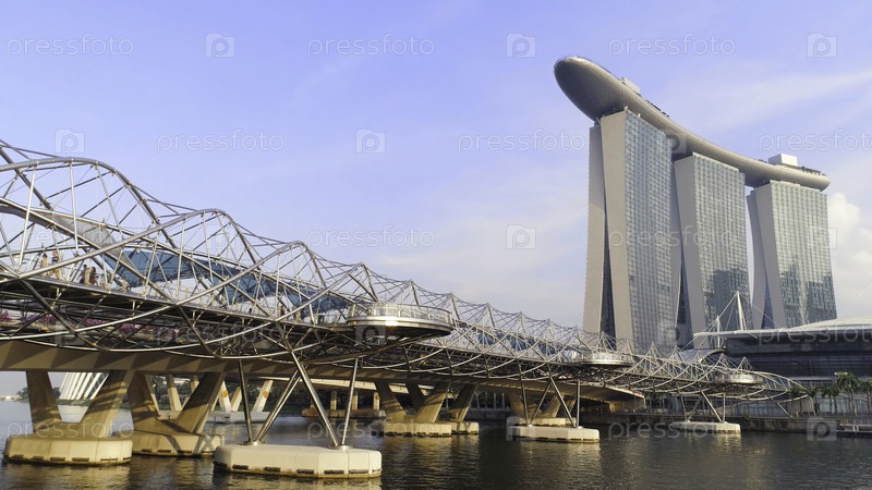 Сверху вид на красивый горизонт города Сингапур с видом на мост Хеликс и отель Marina Bay Sands с парком на голубом небе.Снимать.Концепция города в будущем