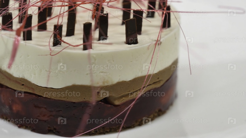 Кремовый торт с тремя слоями на тарелке, украшенный шоколадными крохи и 4K-шоколадной соломой