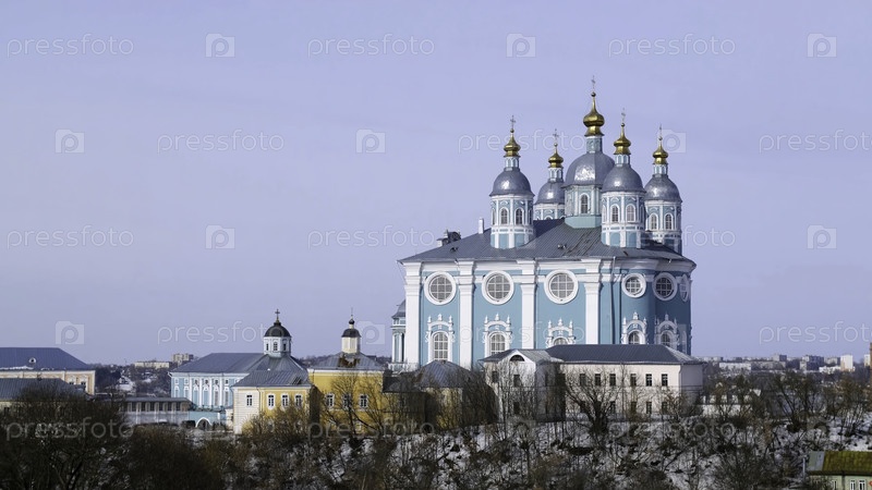 Красивый голубой храм на фоне города зимой. резервные кадры. Успенский собор в Смоленске возвышается над городом на фоне неба