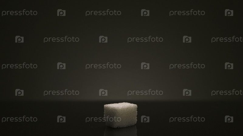 Один кубик сахара выделен на тёмно-сером фоне.Закройте белый кубик сахара, стоящий в тени ярким светом