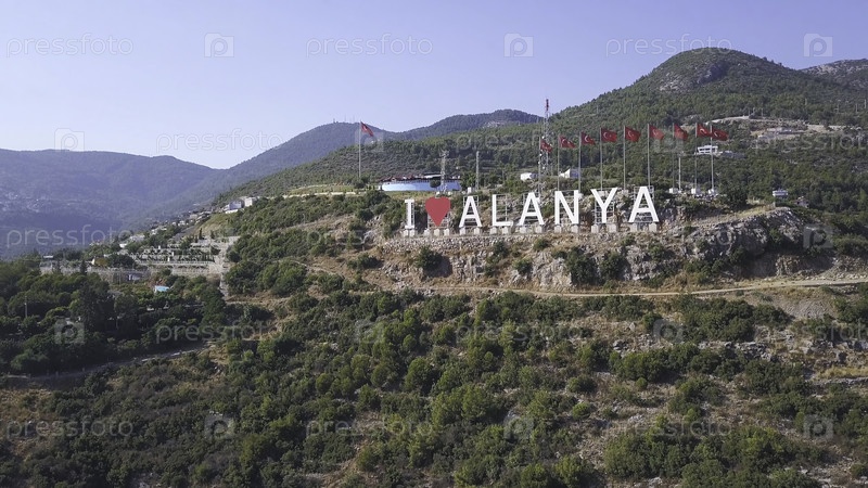 Вид с воздуха надписи 'Я люблю Аланию' в парке в горах Аланьи и красные турецкие флаги летом на синем небе