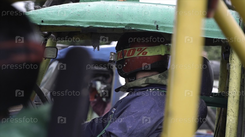 Москва, Россия - сентябрь 2018: Ближайшее изображение водителей и внедорожников, принимающих участие в ежегодных внедорожных гонках. Конкуренты на внедорожниках начинают свою карьеру в сельской местности. Концепция конкуренции автомобилей в природе