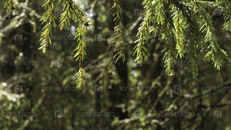 Замыкающие иглы, освещенные солнечным светом в дождь. Резервная запись. Солнечные лучи проникают через дождевые иглы зеленой пихты