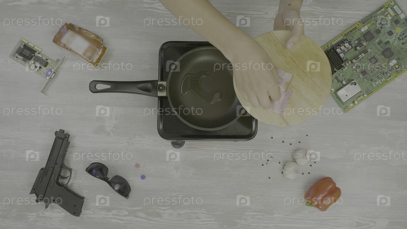 Человек готовит мясо в сковороде.Человек готовит ветчину на сковородке, на столе: пистолет, бокалы, чипсы и перец, абстракция для инстаграм-тарелки