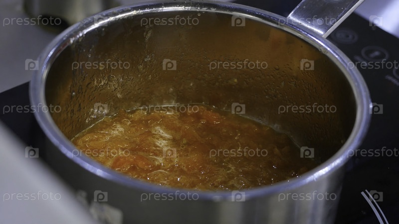 Тыква кипит в горшке на плите. тыквенный сироп кипит в горшке. вкусный тайский десерт