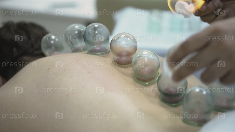 Массаж вакуумных банков. Закрытие человека, лежащего с банками на спине в спа-салоне. Вакуумные банки при лечении и косметологии