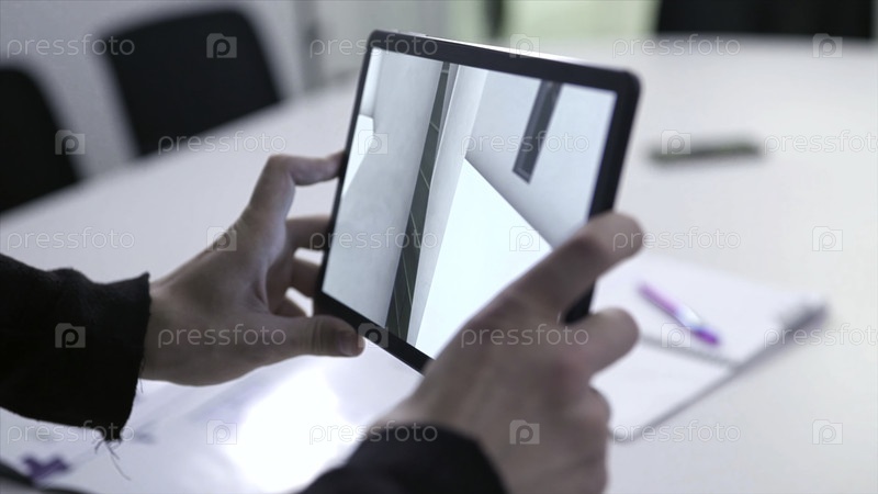Виртуальный рисунок дома на планшете.Сток. Бизнесмен держит планшет с проектом виртуальной реальности у себя дома в зале совещаний.На гаджете отображается цифровая 3D-модель проекта недвижимости