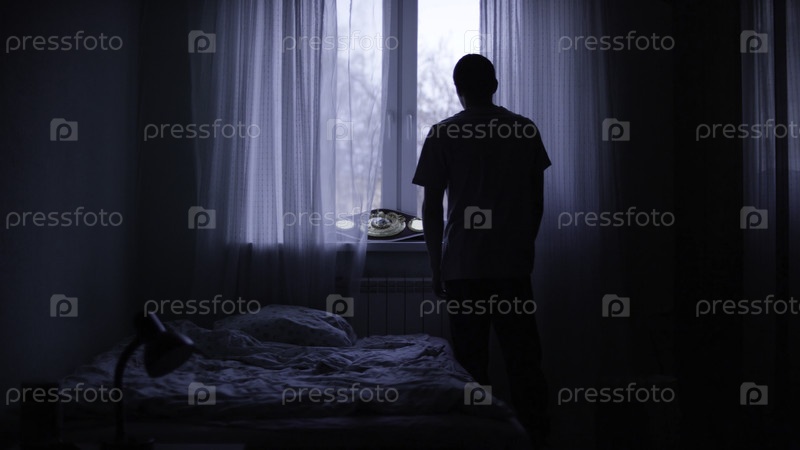 Одинокий мужчина смотрит в окно, закрытое занавесками в спальне