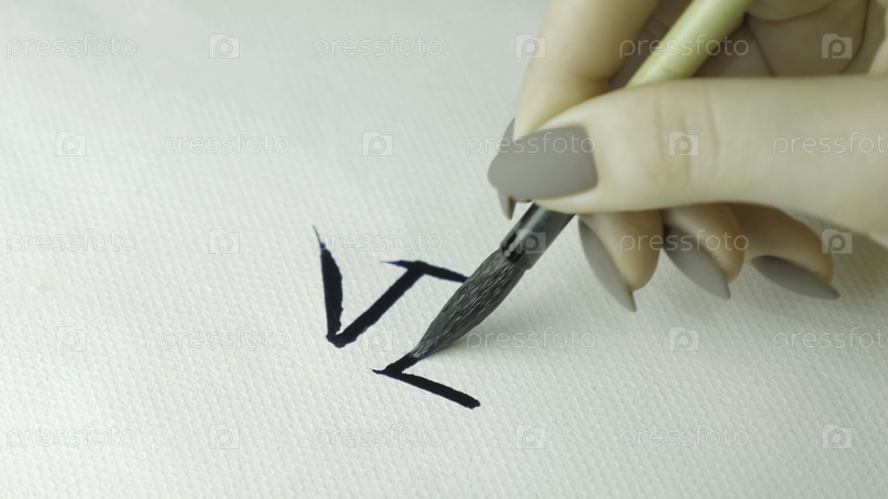 Рука женщины, держащей письменную кисть из каллиграфии китайских символов, закрывается