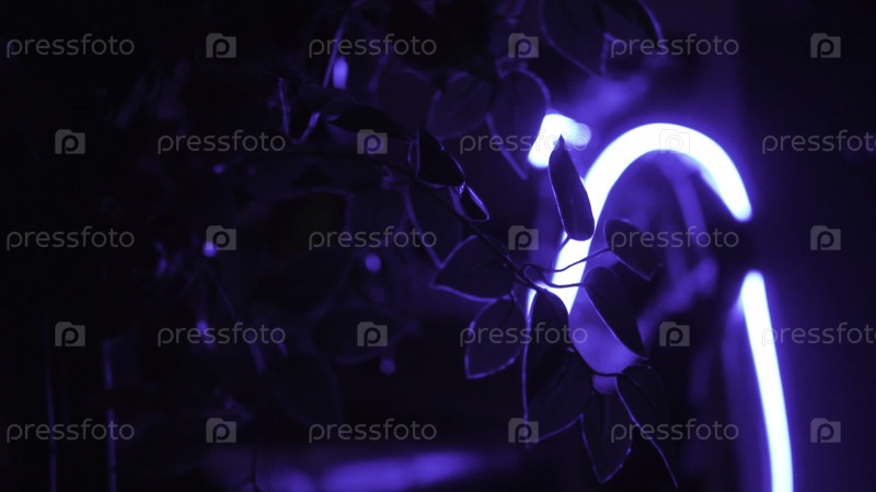 Листья деревьев против голубого ночного освещения. кадры. футуристический вид парка будущего