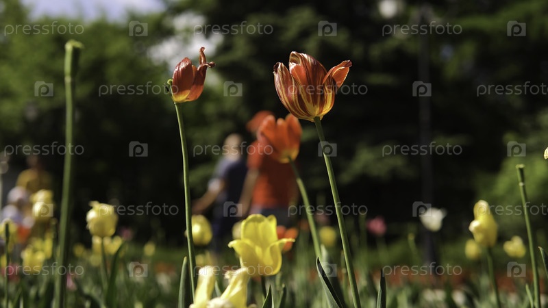 Красные тюльпаны в солнечный день.Запасная запись.В парке растет красивый тюльпан
