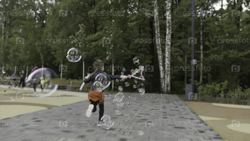 Активная маленькая блондинка со сковородой, создающая пузыри во время бега в городском парке
