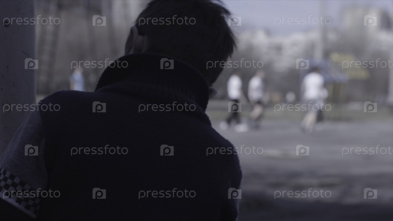 Одинокий мальчик сидит на скамейке и смотрит, как его друзья играют в футбол