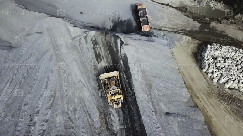 Вид сверху на тяжелую технику, экскаватор и грузовик, работающие в песчаном карьере. резервные кадры. вид из воздуха коммерческой земли и транспортных средств, работающих на месте карьера