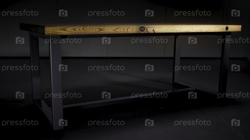 Деревянный стол на чёрном фоне. Резервные кадры. Закройте деревянный стол с черными железными ногами, стоящими в пустой комнате во тьме, которая меняется со светом