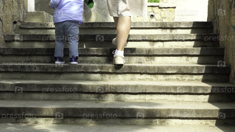 Женщина помогает своему маленькому сыну подняться по лестнице, держа его за руку