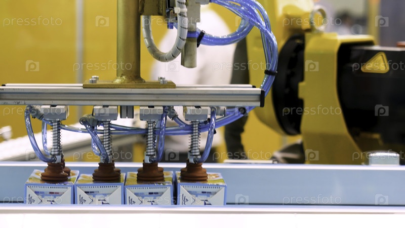 Механический робот с искусственным интеллектом сортирует продукцию на конвейере, концепция современных технологий. СМИ. Промышленные машины и заводские роботы берут небольшие коробки