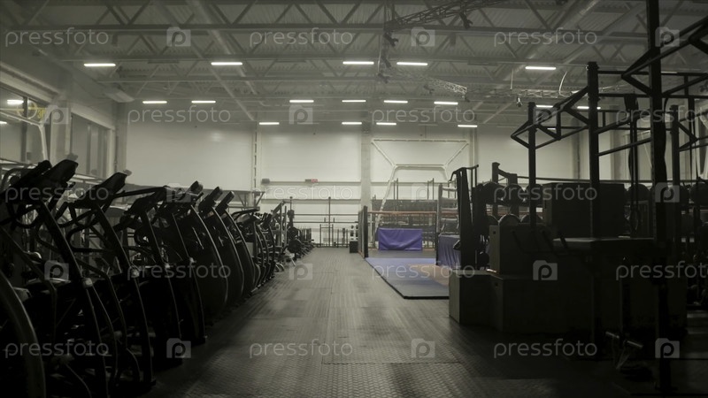 Включите свет в пустом фитнес-зале. идите дальше. темный фон тренажерного зала с тренировочными велосипедами и оборудованием для фитнеса, концепция спорта и здорового образа жизни
