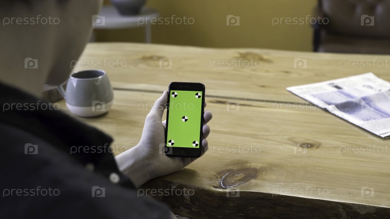 Вид через плечо бизнесмена, использующего портативный мобильный телефон с зеленым сенсорным экраном на деревянном столе. резервные кадры. Человек наслаждается своим устройством chromakei