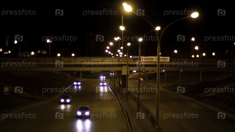 Прекрасная уличная сцена ночью с большим количеством автомобилей, ночным движением. резервные кадры. поздно вечером дорога под уличными фонарями полна транспортных средств, двигающихся в разных направлениях