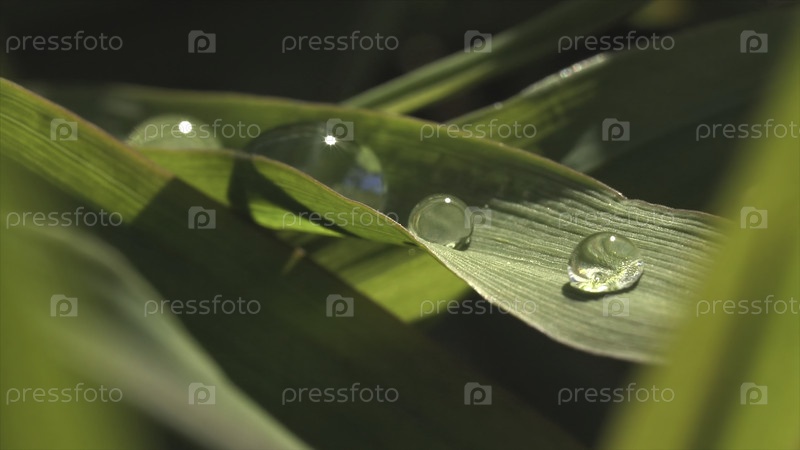 Закройте капли росы на зеленый травяной лист. Движение. Летний луговый ландшафт со свежей зелёной травой, вода которой падает после дождя, дикая природа. Экология и концепция Дня Земли