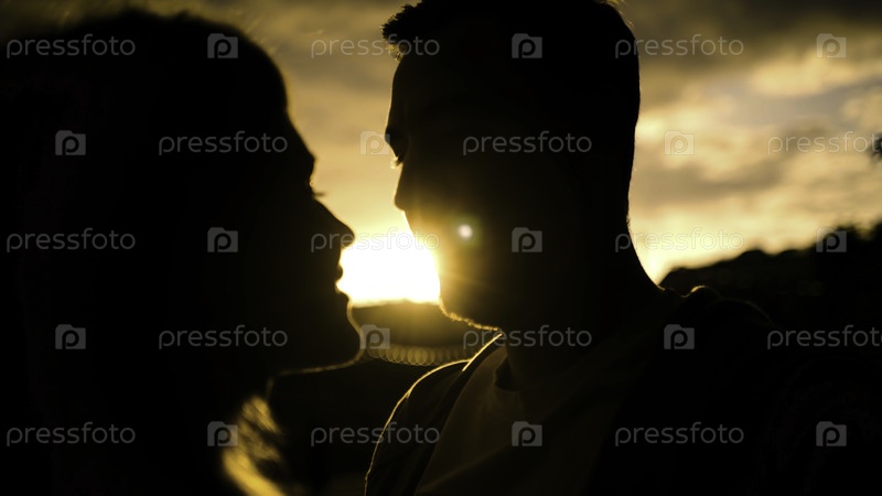 Силуэты влюбленной пары на фоне солнечного света. Продолжайте. Любящая внешность и нежность молодой пары на фоне яркого заката. Романтические темные силуэты