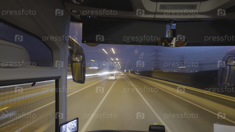 Временная задержка с кабины пилота. Продолжайте. Водитель грузовика едет по пригородной автомагистрали с горящими огнями вечером. Временная задержка поездки водителя на шоссе