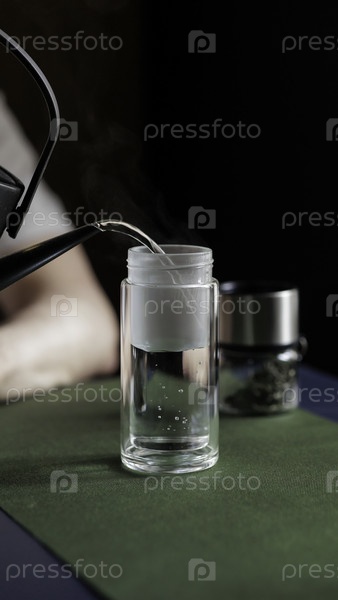 Спокойный и спокойный момент наступает, когда горячая вода мягко разливается в прозрачное стекло, идеально подходит для любителей чая или кофе