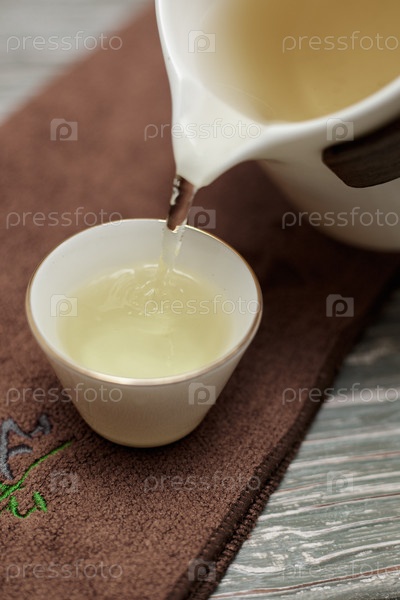 Осторожно наливать чай из классического белого чайника в красиво украшенную маленькую чашку