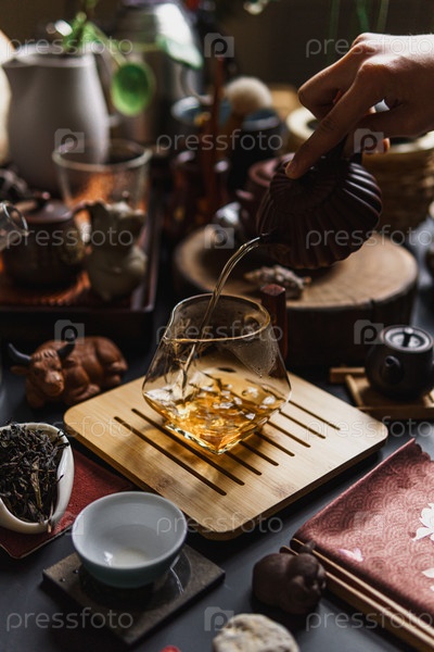 Запечатлеть спокойный и успокаивающий процесс заваривания чая, который разворачивается среди красиво выполненных традиционных чайников