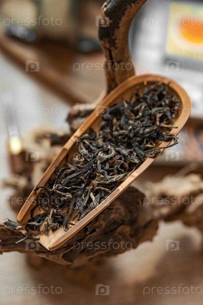 Красиво яркий дисплей чая с свободными листьями, расположенный в деревянной ложке, опирающейся на поверхность села
