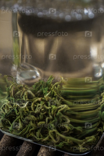 Клубовое изображение показывает свежие листья зеленого чая, которые аккуратно замочиваются в стеклянную банку, которая заполнена чистой водой