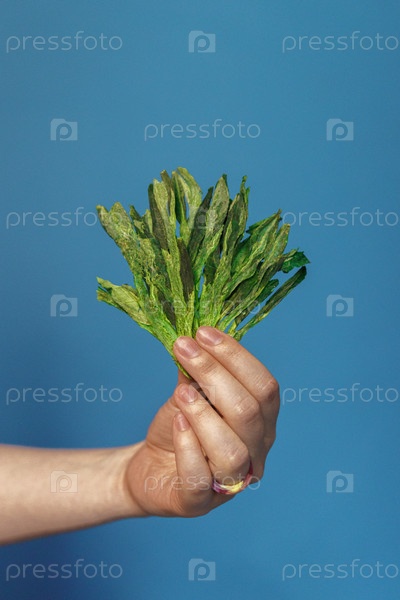 Рука грациозно держит обильную кучу ярко-зеленых листьев, которые идеально подходят для кулинарных и ботанических тем
