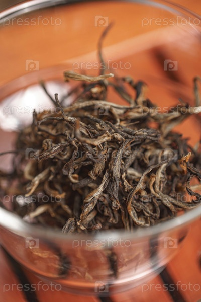 Сушеные чайные листья показаны в современной стеклянной миске, естественный ингредиент с вкусом