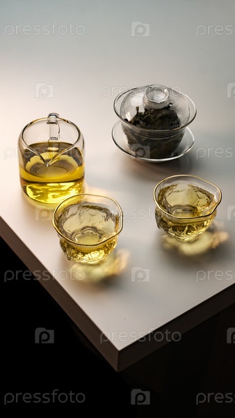 Спокойная среда с зеленым чаем, элегантными кружками и свежими чайными листьями, идеально подходит для любителей и энтузиастов чая