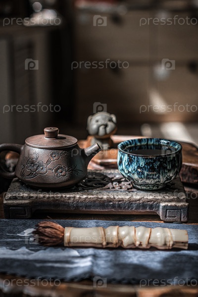 Красивый чайный набор с прекрасным чайником, элегантной чашей и очаровательной щеткой для уютных моментов