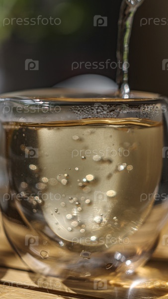 Освежающая газированная вода подается в красивом стакане, который готов насладиться и наслаждаться