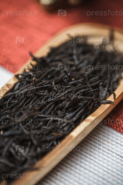 Красивая деревянная миска, наполненная сушеными листьями черного чая приглашает насладиться ею