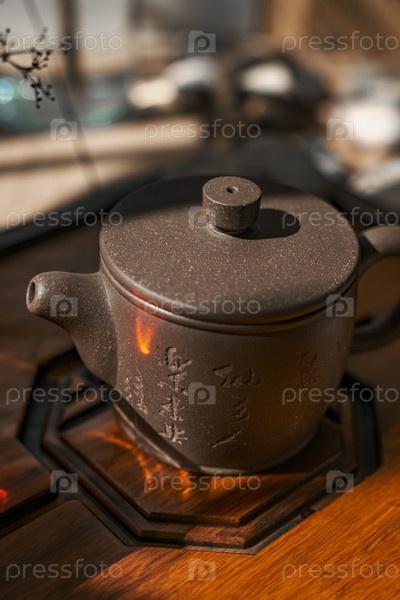 Элегантный чайник с красивым дизайном каллиграфии на деревянном столе