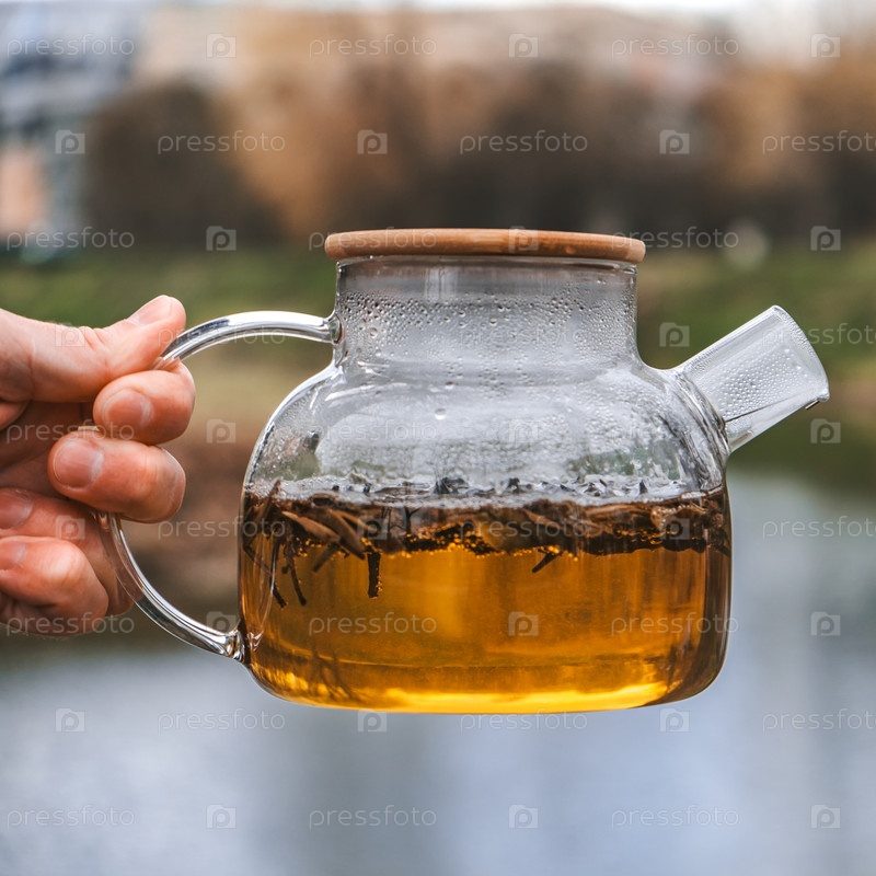 Красивый стеклянный чайник, наполненный травяным чаем среди потрясающего пейзажного фона